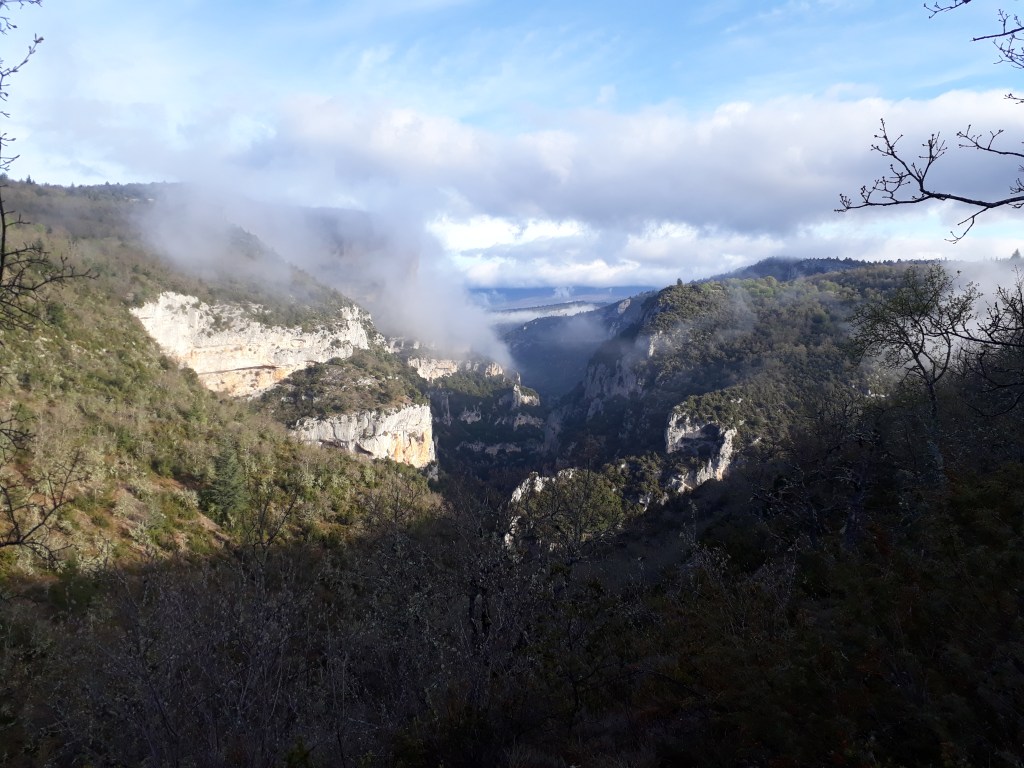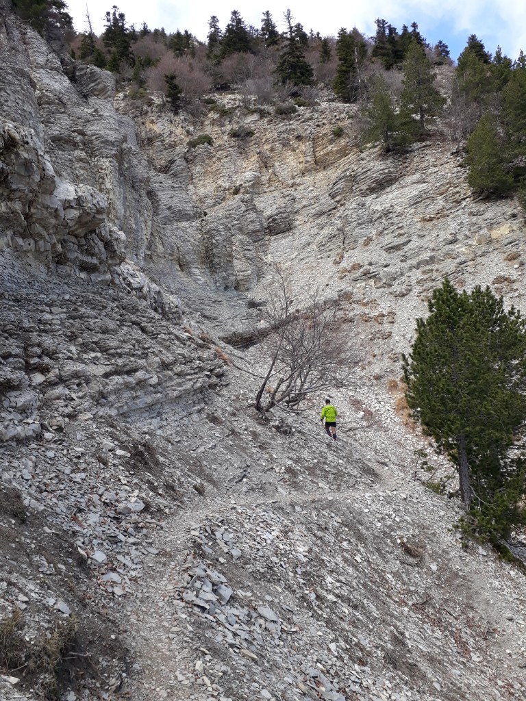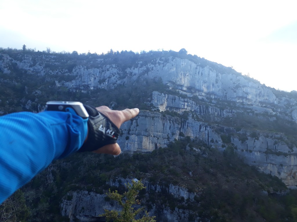 Ca repart en descente, on attaque le technique, le soleil nous réchauffe enfin, au 28ième je tombe sur Ben, je suis surpris, il est bien mais gère les descentes. On fait un bout de chemin ensemble, c’est cool, mais dans la montée vers les Gorges, il lâche du terrain, bizarre, j’espère le revoir plus tard… J’arrive au 30ième km sur le premier des 3 sites majestueux au programme du jour : les gorges de la Nesque :