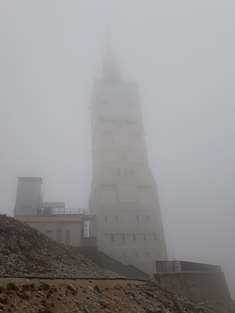 Je prends quand même mon premier « éclat » à 200 m du sommet, coup de mou en plein froid il fait presque -10°C ressenti. Arrive enfin le point sommital de ce géant que j’ai tant regardé à la télé sur les étapes du tour, un ravito nous attend…en plein vent: « BIG » chapeau pour les bénévoles qui nous encouragent et ravitaillent des coureurs qui ne s’arretent pas à cause du froid.