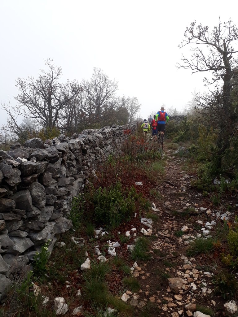 C’est parti, le peloton de 300 trailers est lancé dans la nuit, les 10 premiers km s’avalent avec aisance, comme la première montée d’ailleurs vers le « Col de la Ligne ». Le jour se lève, je monte au train, je pourrais doubler mais je préfère temporiser, je suis bien. Ben part devant, je pense à ce moment là ne pas le revoir, il est en forme le bougre. La surprise de ce début de course est le froid, je pensais courir dans la douceur printanière eh bien non, une jolie brume empêche le soleil de nous réchauffer. Nous longeons « le mur de la peste »