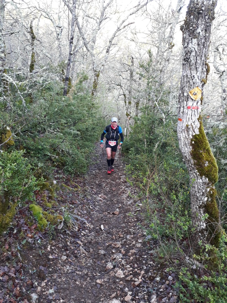 Je bascule sur l’autre versant qui lui est abrité du vent, il fait à nouveau bon (15°C je pense), que c’est bon, j’ai les doigts gelés. Arrive une des grosses difficultés de la course, 16km de descente, qui promet l’enfer à mes petits quadri de Normands 😱. Première partie: de la caillasse évidemment, où j’aurai l’occasion de remettre sur le bon chemin la future 2ième féminine partie dans la mauvaise direction. La suite de la descente est moins technique, il faut serrer les dents pour s’empécher de marcher synonyme de perte au classement, accepter la douleur qui te flingue les cuisses, tenir, tenir, j’emmène au passage un trailer jusqu’en bas, ça motive. C’est quand même dingue de réver de « monter » à ce moment de la course…