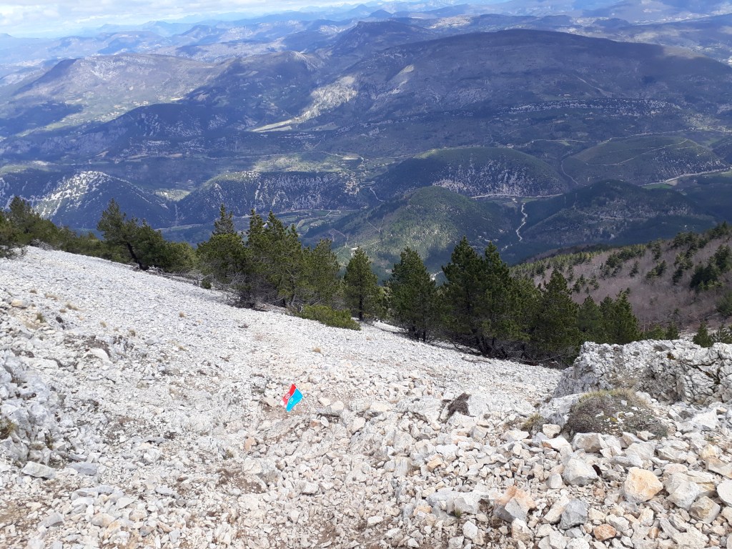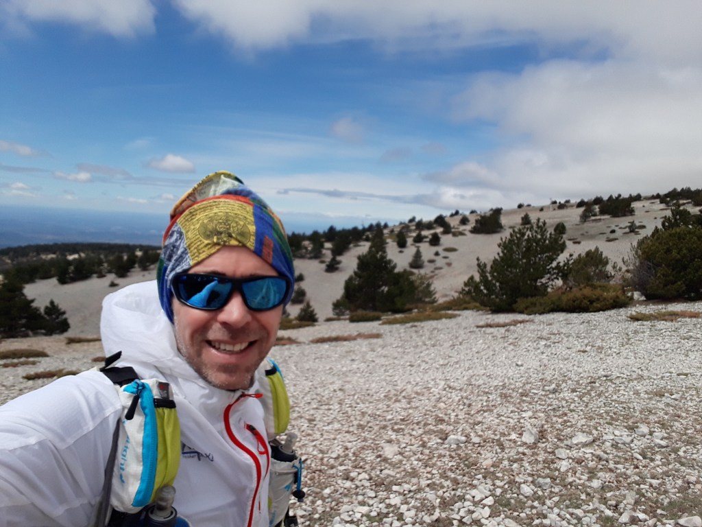 J’attaque l’ascension du Ventoux déterminé, en haut de « la tête de la Grave » on bascule sur la face nord en prenant de plein fouet les rafales de vent. Cette portion jusqu’au sommet du Ventoux est peut-être un de mes moments préférés jusqu’à présent en Ultra, pour 2 raisons : je n’ai jamais été aussi à l’aise en course (50 bornes déjà dans les papattes), je suis bien, léger houhou !! La deuxième raison est que c’est MA GNI FI QUE !! La vue sur les Alpes enneigés à l’horizon, le spectacle de cette nature est grandiose.