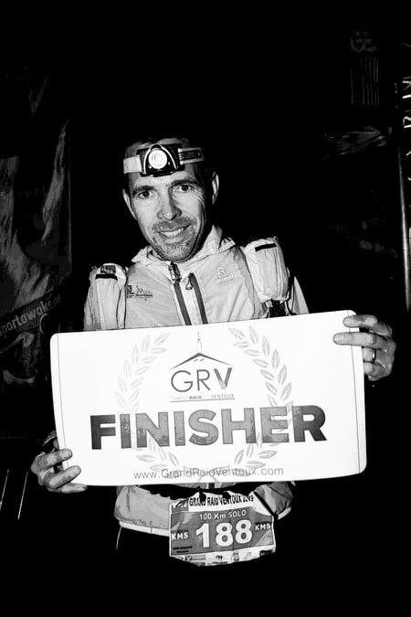 Nous sommes 2, 3 coureurs à faire l’accordéon, on se double et redouble sans arrêt, c’est rigolo comme situation. L’odeur de la bière me monte au cerveau 🍺 bien fraiche oh oui mon seigneur… A nouveau bien sur la fin, à 3 km de l’arrivée, je suis obligé de m’équiper avec la frontale argghh, contraint de la sortir du sac (effort énorme à ce moment précis) en plus je rage car je me fais doubler par un coureur, pas juste…. J’attaque un bois en descente et à 1.5km de l’arrivée mon pied se prend dans une racine, je pars sur l’avant, me protège mais l’impact inévitable est super violent, une grosse pierre me défonce les cotellettes, je n’ai qu’une pensée : avoir peur de ne pas finir. Heureusement, c’est juste une belle ecchymose qui m’attend, un autre coureur me double arrrrggg…. J’entends enfin le son de la musique, de la civilisation, des gens sont sur les bas côtés à attendre leurs proches, l’ambiance est bon enfant et chaleureuse, quelques pas encore et la ligne d’arrivée s’offre à moi au terme de 16h20 d’efforts, 75ieme/300. Quel bonheur, à moi les endorphines lol…