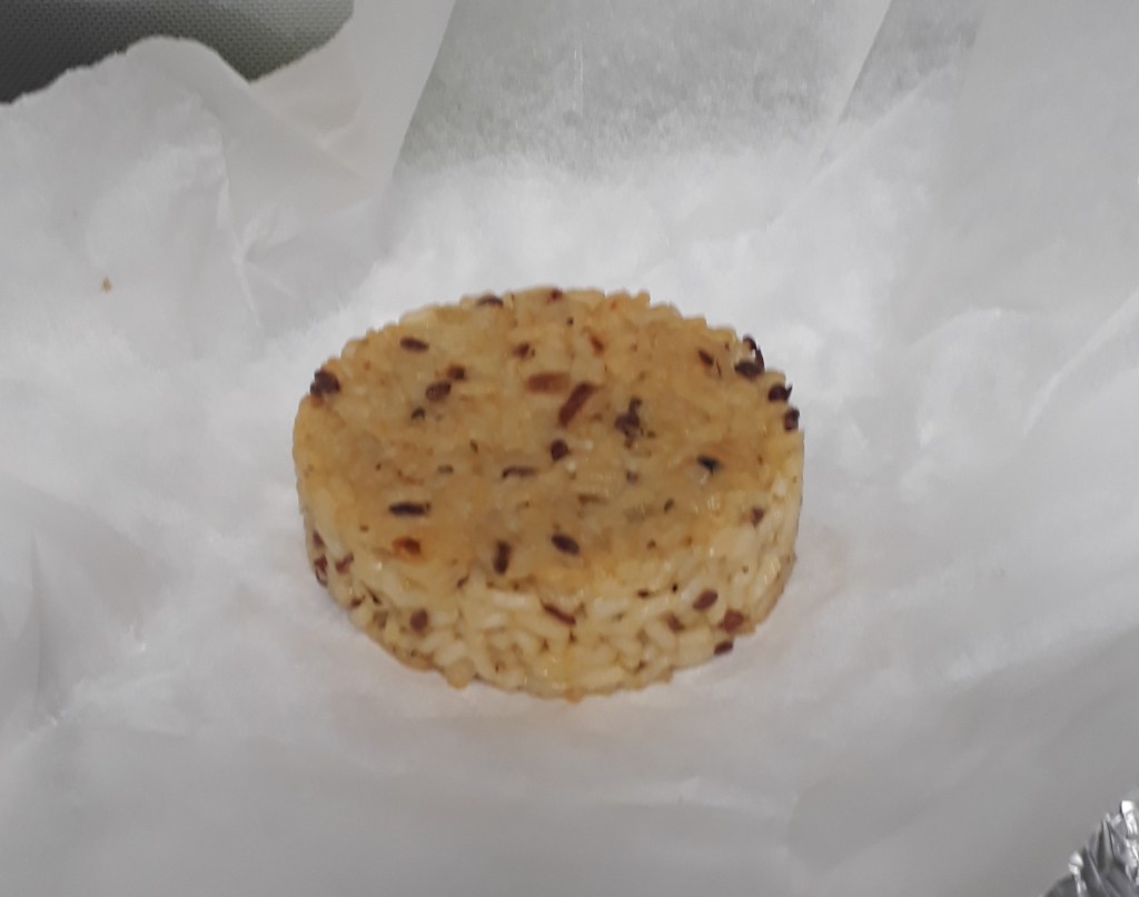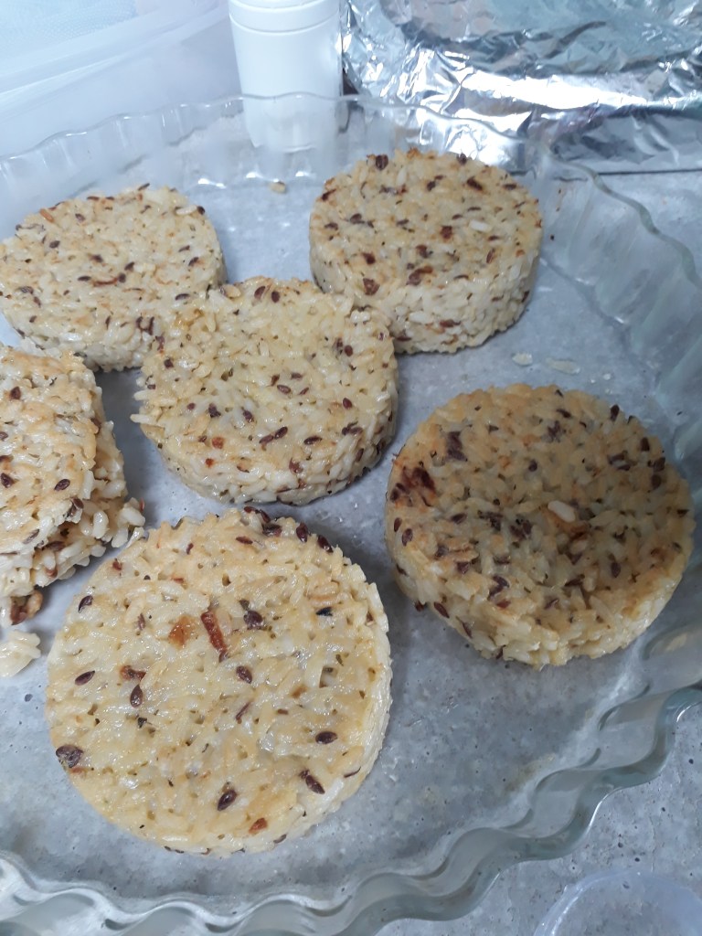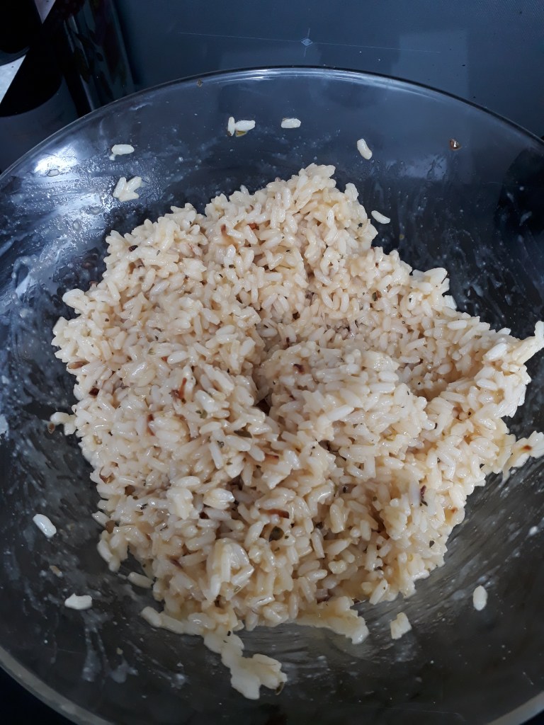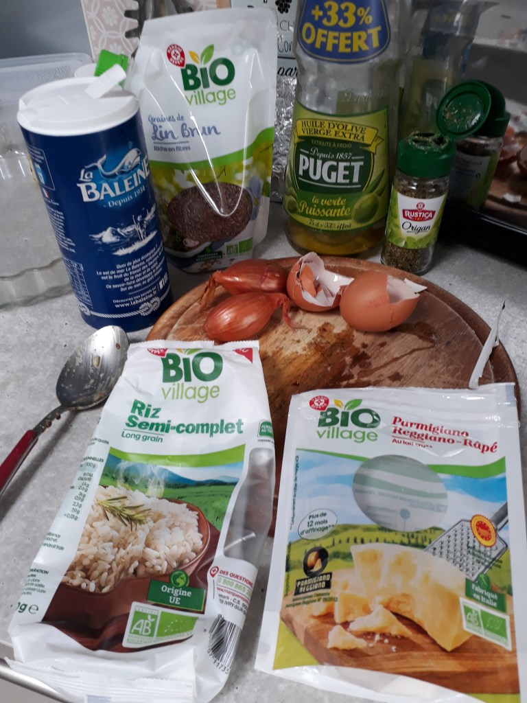 300g de riz complet, 2 échalottes, 2 œufs, 4 cuillères à soupe d’huile d’olive, 1 cuillère à soupe d’origan sec, 1 cuillère à soupe de parmesan râpé, sel, poivre et ma touche perso j’ajoute des graines de lin…