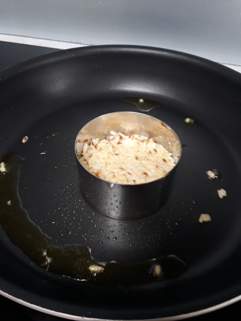 3) Faites chauffer un peu d’huile dans une poêle. Posez un cercle en métal dans la poêle et tassez à l’intérieur un peu de préparation au riz. Laissez cuire 3 min puis retournez délicatement la galette à l’aide d’une spatule. Laissez dorer 3 min. Réitérer l’opéation pour les autres galettes.