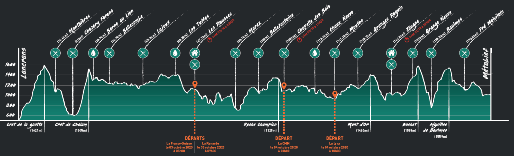 Barrières horaires : 3 barrières horaires mais seulement 1 compliquée pour le commun des mortels à Lajoux au 50ième km en moins de 9h30, 51h pour traverser les montagnes du Jura, départ 8h le vendredi matin de Lancrans, arrivée au plus tard 11h00 le dimanche matin à Métabief.