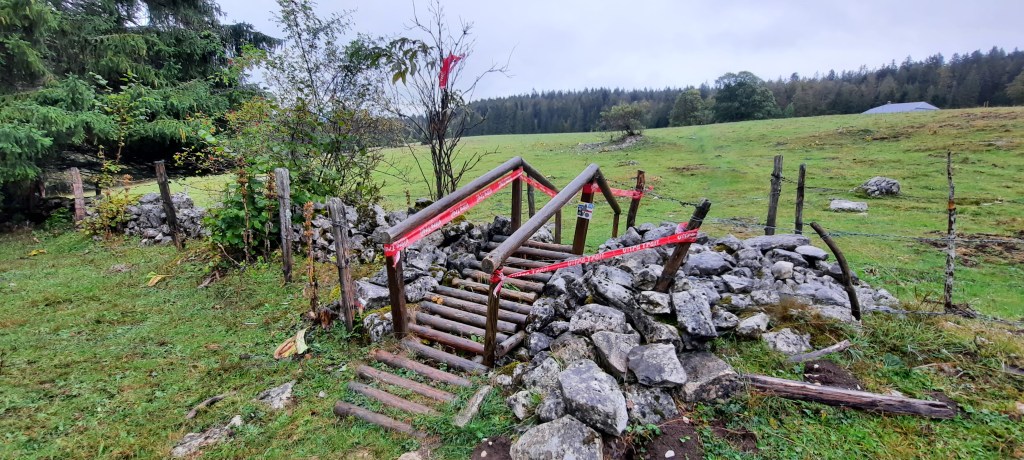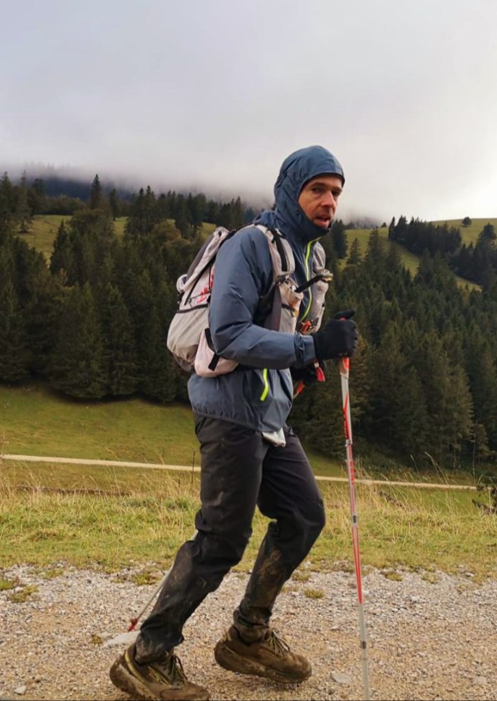 Lajoux au 50ième km marque une étape importante car une barrière horaire assez serrée y figure. Je suis soulagé d’y arriver à 15h30 avec une avance de 2h sur la barrière et 1h sur mon plan. Je suis trempé comme une souche, le ravito est petit, heureusement, Sophie m’a réservé en face un bas de porte où je peux me changer tranquillement. Je suis transi de froid, ma veste de pluie est autant mouillée à l’intérieur qu’à l’extérieur 😭. L’assistance commence à entrer en jeu, elle me propose une nouvelle veste de pluie avec par dessus un vieux K-Way décathlon premier prix. Je ne mets pas pour l’instant mon pantalon ni mes gants imperméables, ce que je regrette aussitôt en repartant tellement mon corps tressaille par le froid. Mais mes pensées sont déjà focalisées sur la nuit de 12h que je m’apprête à vivre.