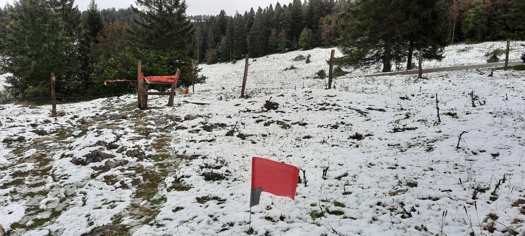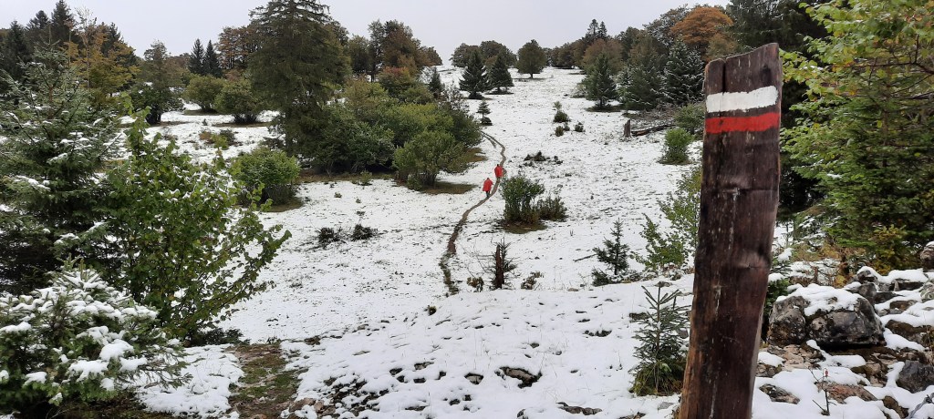 Je monte avec mes bâtons « au train » dans la file de coureurs qui se délie très vite, j’ai François en ligne de mire, Vincent est derrière. C’est boisé, pas trop abrupt, je me sens bien. Le sommet, le crêt de la Goutte (tous les sommets sont nommés crêt, certainement un patois local ?) arrive assez vite quand on est frais (ça non plus ça va pas durer…). Les conditions météos commencent à changer, le froid, le vent et le brouillard nous saisissent littéralement en haut, je remets vite ma veste enlevée lors de la montée et remonte le buff au dessus des oreilles, il y a de la neige par endroit. Un coureur local me dit que la vue est normalement somptueuse sur Genève et le Mont Blanc, ça sera pour une autre fois 🧐…