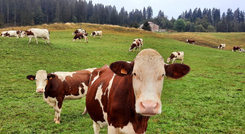 Je repars direction Mouthe, à 60km de l’arrivée, je sais à présent que je vais finir sauf grosse blessure. Le jour se lève, la pluie s’arrête, bordel que c’est bon….J’arrive à Mouthe où je retrouve Sophie, je me goinfre d’un super pâté avec du pain de campagne, je revis….J’attaque l’ascension vers le Mont D’or mais la première partie je ne m’en rappelle pas, à vrai dire je fais des micros siestes en avançant, il fait frais mais beau, quel bonheur… Au ravito Granges Raguin, situé au milieu de la montée du Mont D’Or, on m’annonce une nouvelle qui retient mon attention ⚠ » les 2 dernières ascensions ne se feront pas comme prévues à cause de la neige et du vent, trop dangereux, parcours de repli » … Je reste très prudent quant à cette annonce. J’attaque le Mont d’Or gonflé à bloc, c’est super joli, plus on monte dans les alpages plus il y a de la neige et des troupeaux de vaches qui broutent paisiblement.