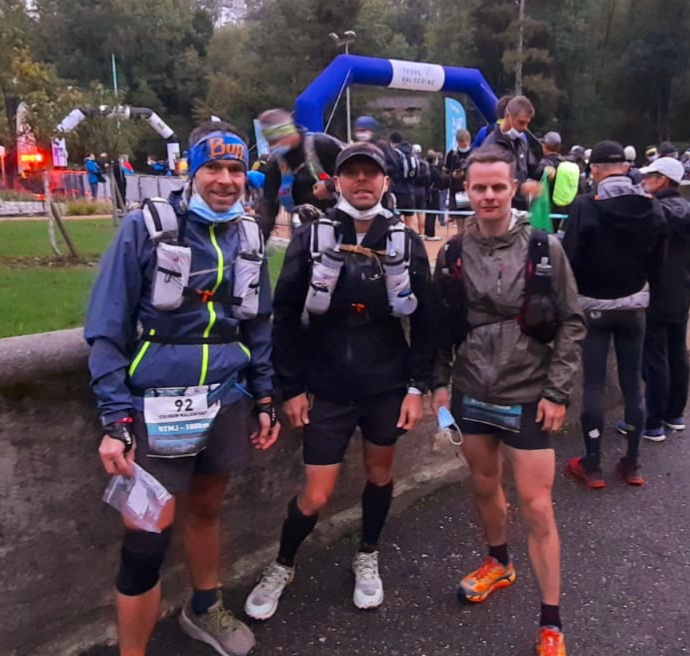 10, 9, 8, 7…7h59 vendredi 2 Octobre, Hells Bells d’AC/DC ⚡️ à fond dans la sono, cela fait des mois que j’espère vivre ce moment en 2020, prendre le départ d’un ULTRA !! Et ce n’est qu’à ce moment où je réalise l’épreuve qui m’attend vraiment 😱… La crise sanitaire a complètement annihilé mon appréhension de la tâche à venir, car je n’y croyais vraiment pas jusqu’à cet instant. La preuve en est, le directeur de course nous apprend qu’ils n’ont reçu l’autorisation définitive que la veille du départ !! Big up énorme aux organisateurs qui ont su tenir contre vents et marées (expression normande 😂). A mes côtés, François et Vincent, engagés dans la même aventure ou galère selon les sensibilités de chacun. 6, 5, 4…un dernier coup d’œil à Sophie, ma petite chérie 🥰 mais surtout ma fidèle assistante sur cet ultra qui va se révéler salvatrice dans la réussite de cet objectif. 3, 2, 1 GOOOO !!! C’est parti pour 180 kilomètres à travers les montagnes du Jura.