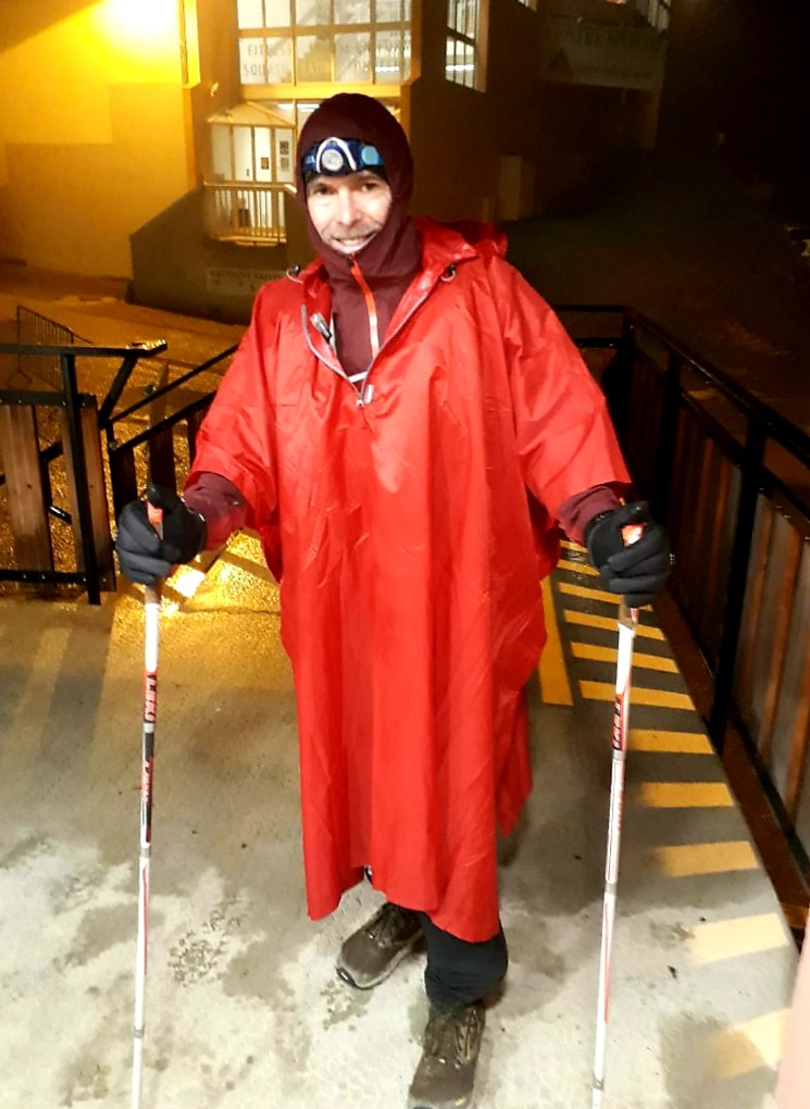 Moi pendant ce temps je me change complétement, me « nok » les pieds et tout ce qui s’irrite 😂. L’arrêt est plus long que prévu de 10min mais le bonhomme n’a pas vraiment envie de repartir dans la nuit noire et obscure (# les inconnus) sous les trombes d’eau et probablement seul….Une dernière vérification des lampes frontales, la mise en place du poncho (1er prix décath) et c’est parti pour le combat mental !!