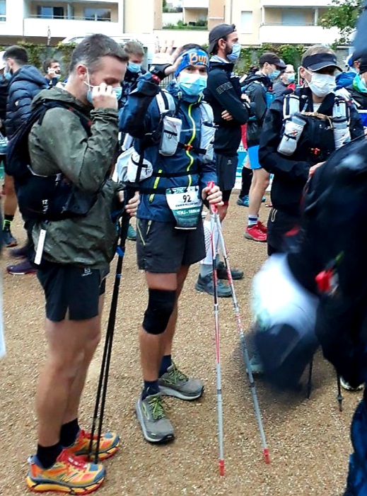 Nous sommes 221 coureurs au départ, il fait sec et frais (ça va pas durer 😭). J’enlève le masque dès que Vincent me signale qu’un panneau nous l’autorise. Nous attaquons d’entrée par une patate de 1200 m de D+. Pour avoir étudié le profil il y a 2 grosses montées sèches successives, donc faut surtout pas se cramer !! Dès les premiers mètres je sens ma douleur au tendon gauche (au talon exactement) qui me titille… Ok je comprends que je vais souffrir mais je décide d’occulter cette douleur quitte à me blesser, je sais ce n’est pas très intelligent mais sinon j’arrête tout de suite, trop de chance d’être là je vais pas commencer à me plaindre…