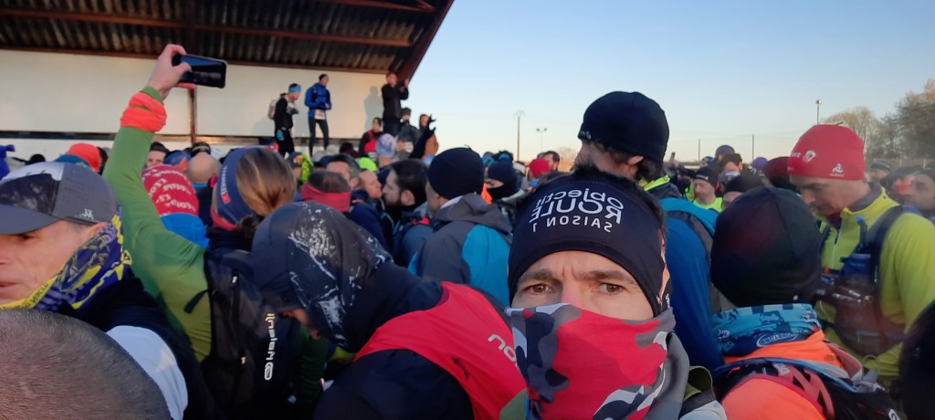 Autant vous dire qu’on a mal dormi, nous sommes congelés !! On se réveille à 6h00 du mat’, le froid nous tétanise, Juju n’est plus cohérent il débute ses phrases sans les finir 😳😅. Faire un café est une gageure car même l’action d’allumer le gaz est compliqué. Je suis pris de crampes au ventre, je vous laisse imaginer la scène : dehors caché derrière un paréo pour soulager le bidon par -3° et tout ça à 20minutes du départ… 7h43 la délivrance 💩🥳 libéré, délivré, les choses sérieuses peuvent commencer !! On arrive tant bien que mal sur la ligne où attendent 315 coureurs prêts à en découdre, le premier défi est relevé, ouf…