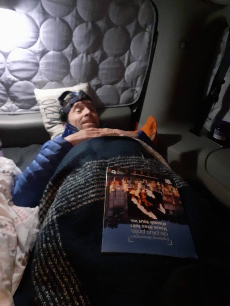 L’heure de la petite bière a sonné, avec la musique qui va bien on refait le monde, j’adore ces moments de convivialité. Par contre la température descend aussi vite que notre bière, sans chauffage la nuit risque d’être rude ❄️. Après avoir mangé la traditionnelle salade de pates complètes il est temps de se mettre au lit, la température avoisine les 0°….