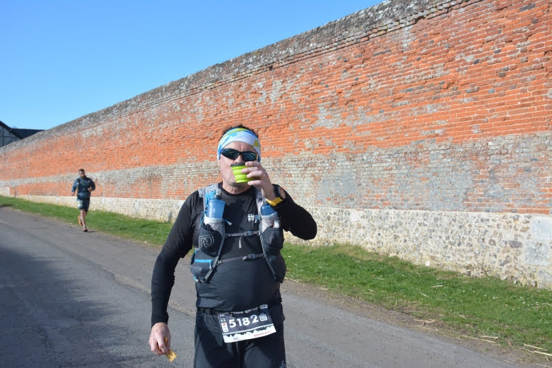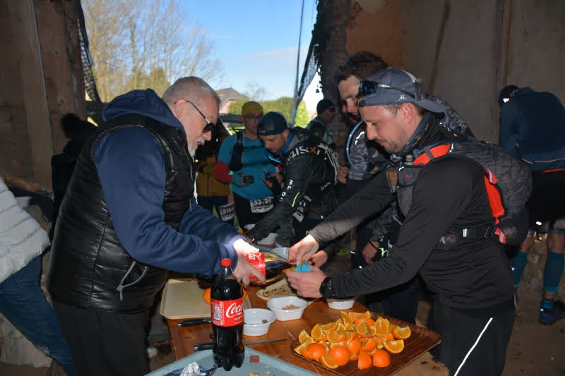 Le premier ravito arrive au 18ième km, j’en profite pour chopper 3 bouts de bananes et 2 gorgées de coca, choses rares il y a de la Saint Yorre, ma boisson préférée (en course évidemment 🍺🥃🍷…). Je ne m’arrête pas car je suis en mode compét, bin oui on a beau être amateur il n’y a rien de plus énervant de voir un gars te doubler au ravito alors que t’as tout fait pour ne pas qu’il te double les 10km d’avant… Niveau autonomie je suis parti avec mon sac 5L decathlon, 2 gourdes de 500ml, 1 remplie à l’iso-citron decat et l’autre à la Saint Yorre, une banane, une barre Trek et une pompote. Je serai un peu juste sur la fin de course, car un ravito liquide au 28ième km puis le 2ieme ravito solide au 41ième.