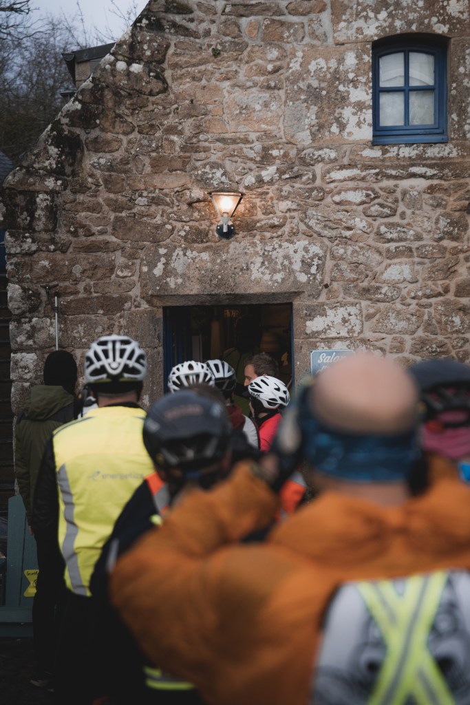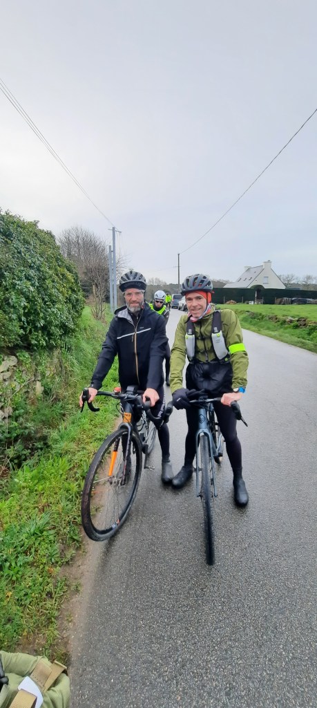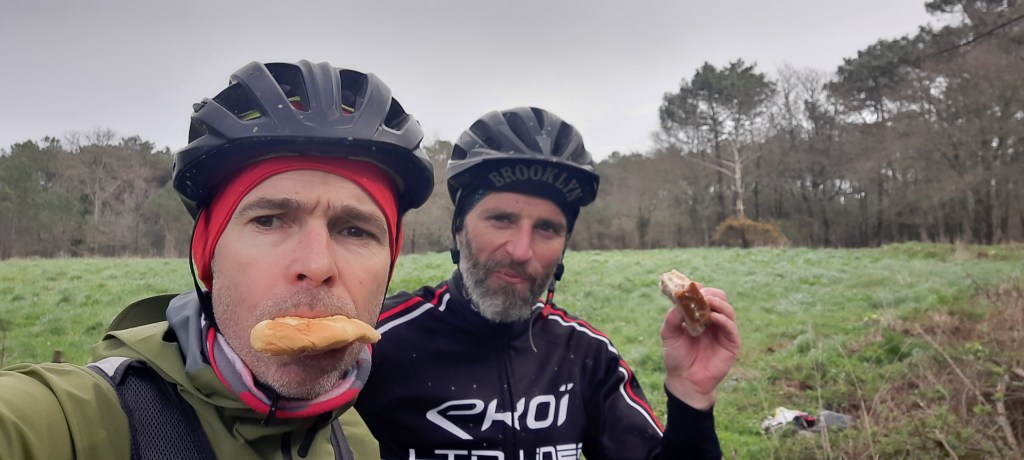 Au 80ieme, au village de Brandérion, Greg a trop faim, il mangerait une poule vivante, on s’arrête dans un bistrot, moment hors du temps, on commande 2 coca, Greg vide le panier de vienoiseries, comment fait il pour être aussi mince 🤔 ? On partage ce moment avec un autre coureur, il dit qu’on est costaud à suivre, j’apprécie pas peu fier du compliment 😊.