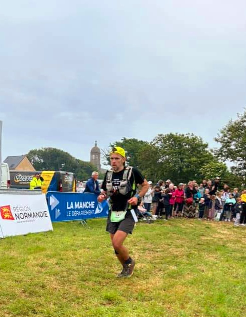 KM50 : Ravito de Beaumont 4h51, une vraie horloge suisse. Sophie est là ❤, j’apprécie sa compagnie à 8h30 du matin, ça booste un max. Je croise Seb qui part quand moi j’arrive mais j’ai besoin de faire 10min de break pour me reprendre un peu. Changement de t-shirt et de chaussettes, mise en place de la genouillère, un bisou et c’est reparti pour la 2ième partie. On rejoint la cote via de petites routes de campagne, ça me va bien pour relancer la machine. Arrivé sur le douanier entre Landemer et Omonville, les choses se corsent un peu, c’est technique et il fait tout à coup très chaud 🥵. Je chute 2 fois comme une m…. par manque de lucidité. Je sens tout de suite que je vais morfler sur la fin, manque de volume à l’entrainement. Mais bon on est à domicile et la famille va être là donc je garde la patate. Je commence à marcher dans les côtes pour m’économiser.