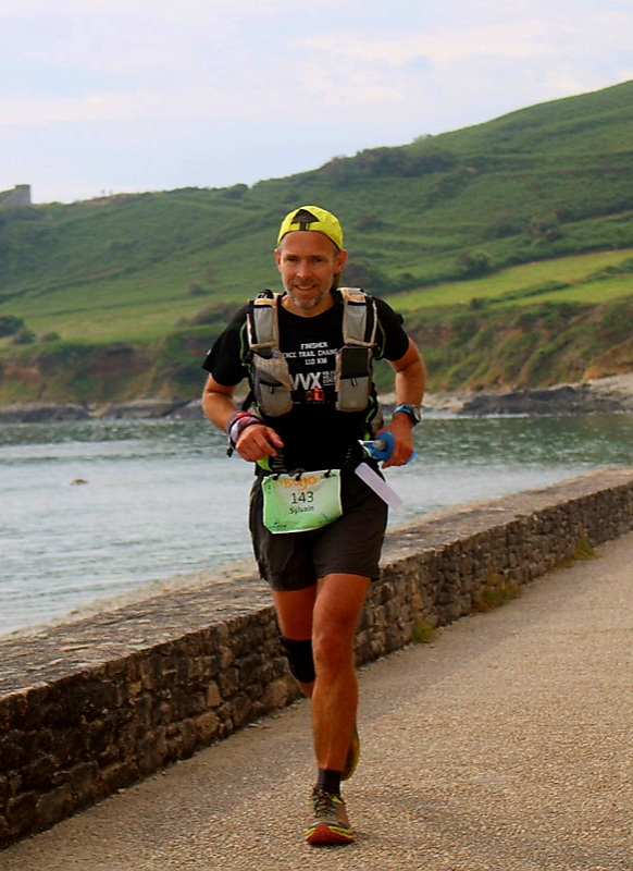 KM45 : Nous sommes redescendus sur la plage pour une longue, longue portion sur le sable et avec à la fin des galets cause de marée haute. Le décor est somptueux, le ciel bleu est apparu et les rouleaux frappent la plage avec force. Malgré tout je commence à puiser dans mes réserves, Seb me lâche à ce moment précis. Pour ne pas arranger ma situation j’ai le fascia gauche qui se réveille juste avant la montée sur Beaumont. Pas de panique, je mettrai ma genouillère placée dans mon sac de base vie et cela règlera le problème. La montée sur Beaumont, que je ne connaissais pas, via la vallée est vraiment chouette…quand t’es frais. Pour l’instant elle passe bien mais au 100ième ça sera une autre histoire naturellement.