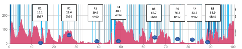 Pour réaliser mon objectif, rentrer dans les 20, j’ai découpé ma course en 2 étapes : une 1ère partie (50km à Beaumont) à 6min/km soit un peu moins de 5h et la 2ième partie (+50km) à 7.1min/h ce qui doit donner du 11h00 pour 100km. Le parcours ayant légèrement évolué, 103km, je peux viser du 11h20…Je finirai finalement en 11h59 😭, +39min de labeurs 😳 et une 22ième place, c’est balot…