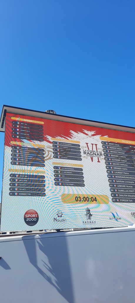 Connaissant la difficulté de l’épreuve ça va exploser façon popcorn avant la moitié des 6h. Après une belle descente, le bord de mer me permet de prendre enfin mon rythme, l’idée est d’être à la limite du rouge, c’est l’avantage du relai. La 2ième partie est cassante avec l’enchaînement du petit Beaumont, des fougères et de la roche fricot. C’est le cardio à bloc que j’arrive à donner le relai en 51′, une claque sur les fesses et c’est parti pour Cécé… Bordel il va falloir répéter ça 4 fois pour ma pomme 🥵. Les dieux Vikings nous gratifient d’une météo estivale, c’est magique 🌞. L’ambiance au village est chaleureuse, c’est vraiment sympa.