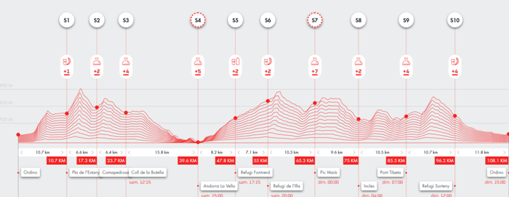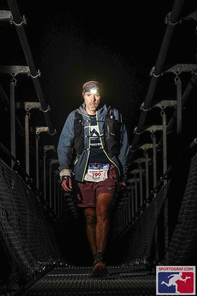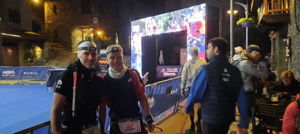 Samedi matin 4h50, Ordino petit village de montagne à 1300m d’altitude, il fait bon, nous sommes levés déjà depuis un moment car notre hôtel (très chouette) se situe à 3 km à pied en contrebas du village, donc petite marche d’échauffement obligatoire à 4h15. Après un contrôle par l’orga des balises GPS (suivi en temps réel), les 650 traileurs/ses s’entassent devant l’église au pied de l’arche numérique « made in UTMB » qui affiche le décompte, histoire de bien foutre les pétoches 😳. C’est le moment où tu commences à te dire que t’es obligé d’y aller sous peine de passer pour un con …