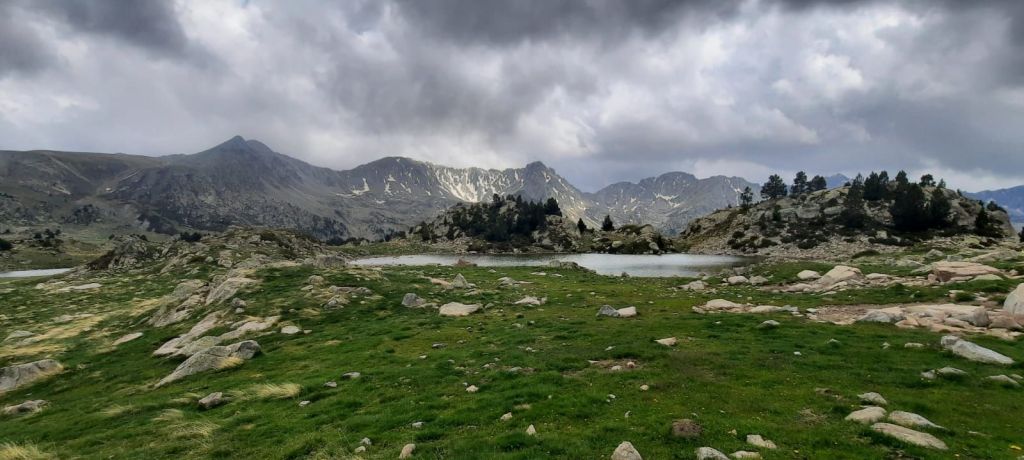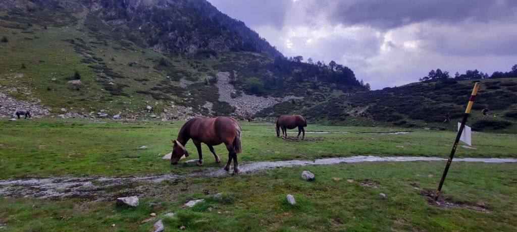 Le 1er ravito et 1er sommet passés, nous arrivons au col de Botella. De superbes chevaux prennent du bon temp en liberté, trop beaux 😍 . S’ensuit une longue descente de 20km direction Andorre la Vieille, capital emblématique de ce petit état. C’est le début d’après-midi et je profite de la base de vie pour refaire le plein des gourdes, manger et reprendre quelques forces. La montée qui s’annonce promet de la souffrance et de la sueur, 18km/1800D+ dans la caillasse, rien que ça…