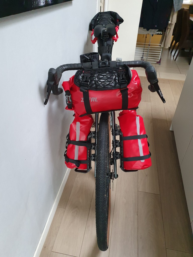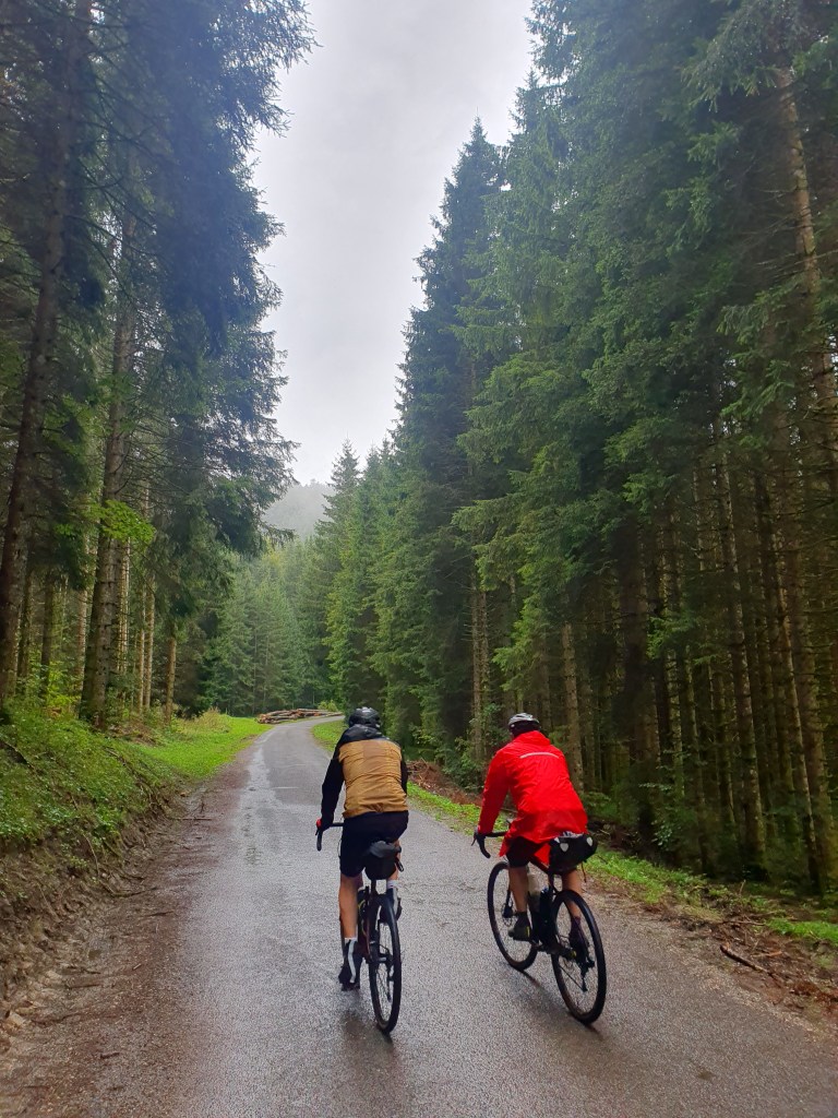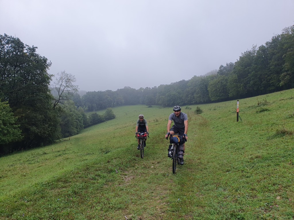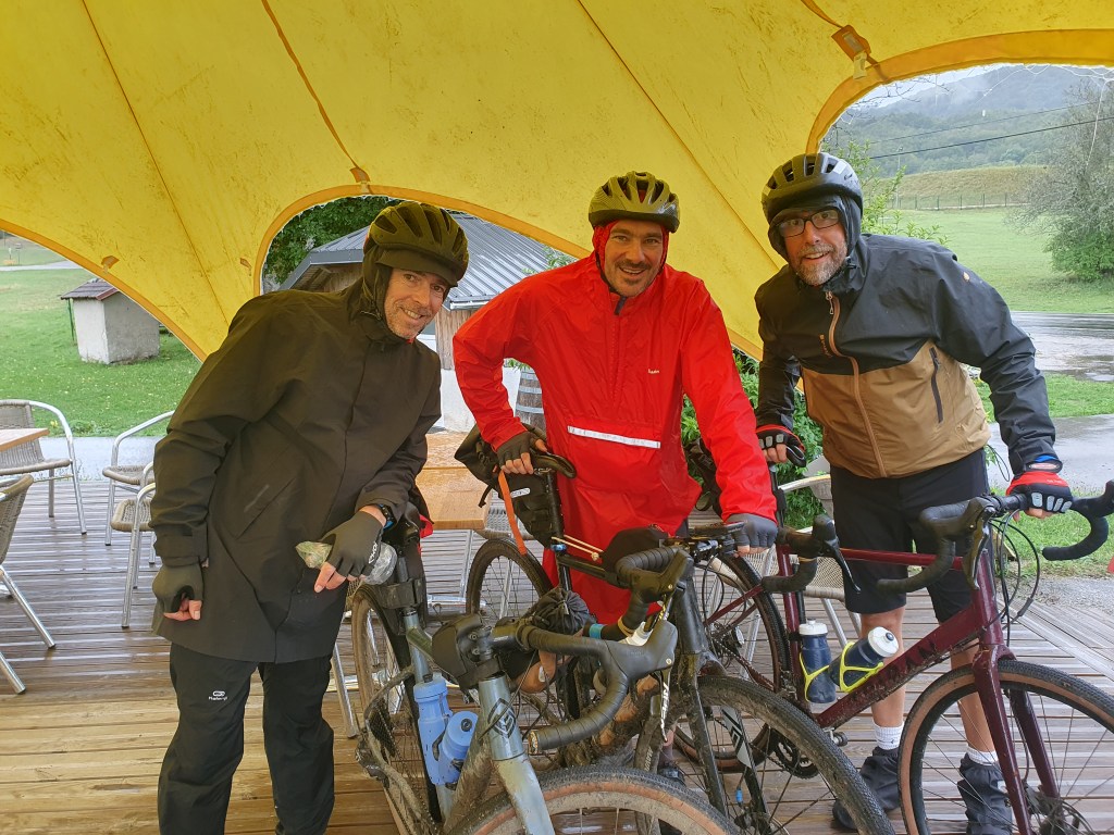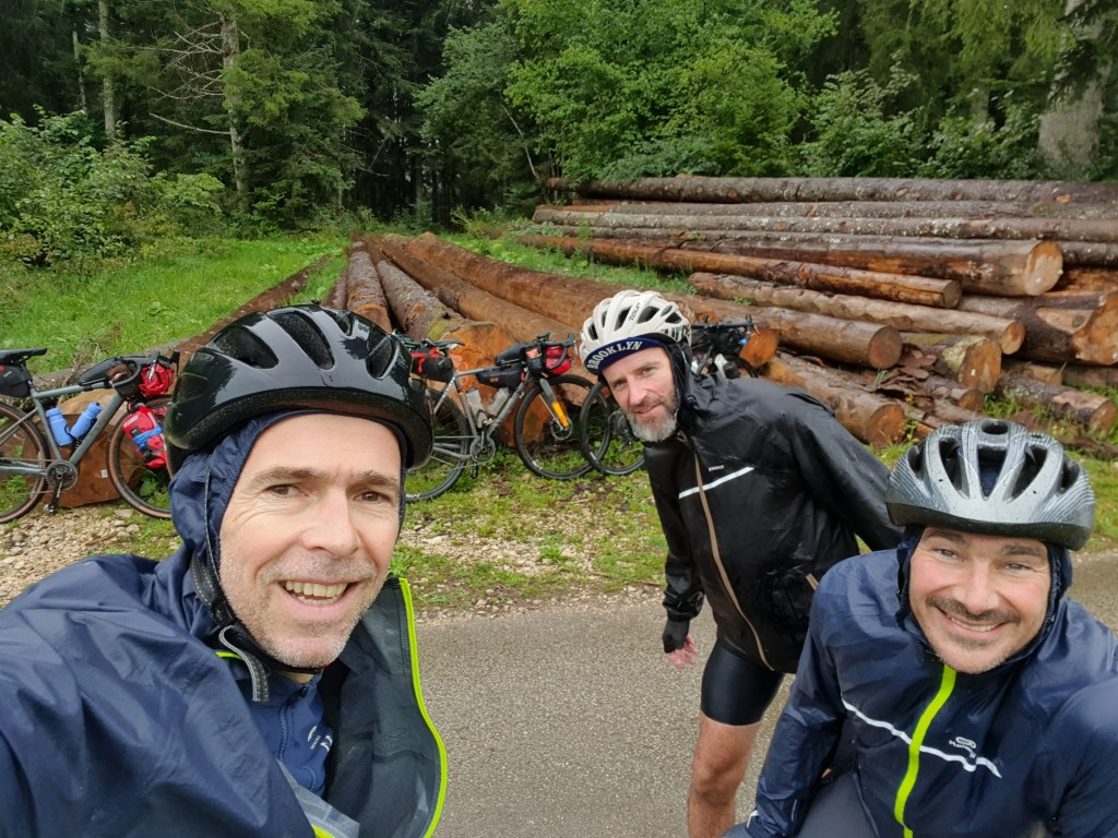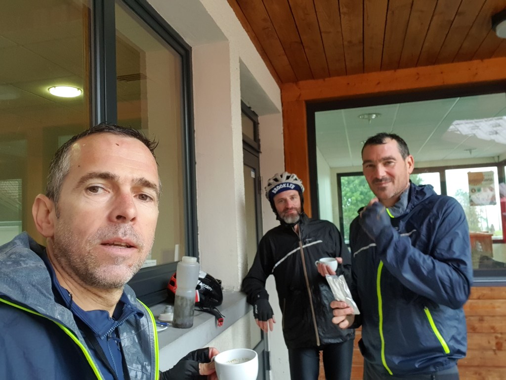 Et la pluie me direz vous ? Eh bien elle fait son apparition dans l’heure de midi, et à partir de ce moment on va prendre très cher !! Il va pleuvoir sans discontinuer jusqu’au soir 💦. La 1ere heure, nos vestes Decathlon font illusion, mais malheureusement nous sommes vite trempés jusqu’aux os. Il faut bien imaginer que cette 1ère journée sur le papier elle est déjà costaud, mais avec les vélos chargés comme des vaches et les trombes d’eau, cela devient vite une mission galère qui mets à mal notre résilience. Heureusement, nous sommes 3 benêts embarqués dans la même aventure et ça donne vraiment la patate !! Donc on sert les dents, on roule tête baissée et on avance en pensant au resto et à la bonne pression qui nous attend le soir. Très vite je me sens de moins en moins bien, pas de jambe, frigorifié et dans le mal comme si je n’avais plus d’énergie 😥.