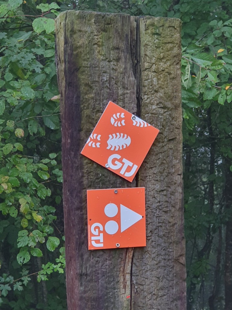 Nous rejoignons le départ officiel de la GTJ au village de Mandeure situé à 5km de l’Hôtel, cela nous permet de tester nos montures, les petits réglages comme la pression des pneus et le serrage des sacoches. Les vélos pèsent 20/21kg en moyenne, ils sont sacrément lourds !! Mais d’un autre côté nous sommes complètement autonomes sur les couchages…. Benoit nous rejoindra le soir du 2ieme jour donc c’est avec Juju et Greg que j’attaque la première côte, il ne pleut pas encore mais le ciel est bien chargé. Les petits singles au départ sont très techniques, racines et pierres jonchent notre parcours, cela ralentit grandement notre allure et le risque de chute est permanent.