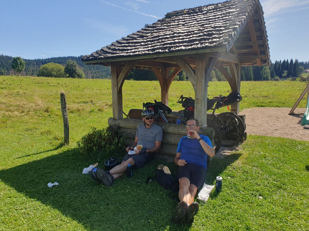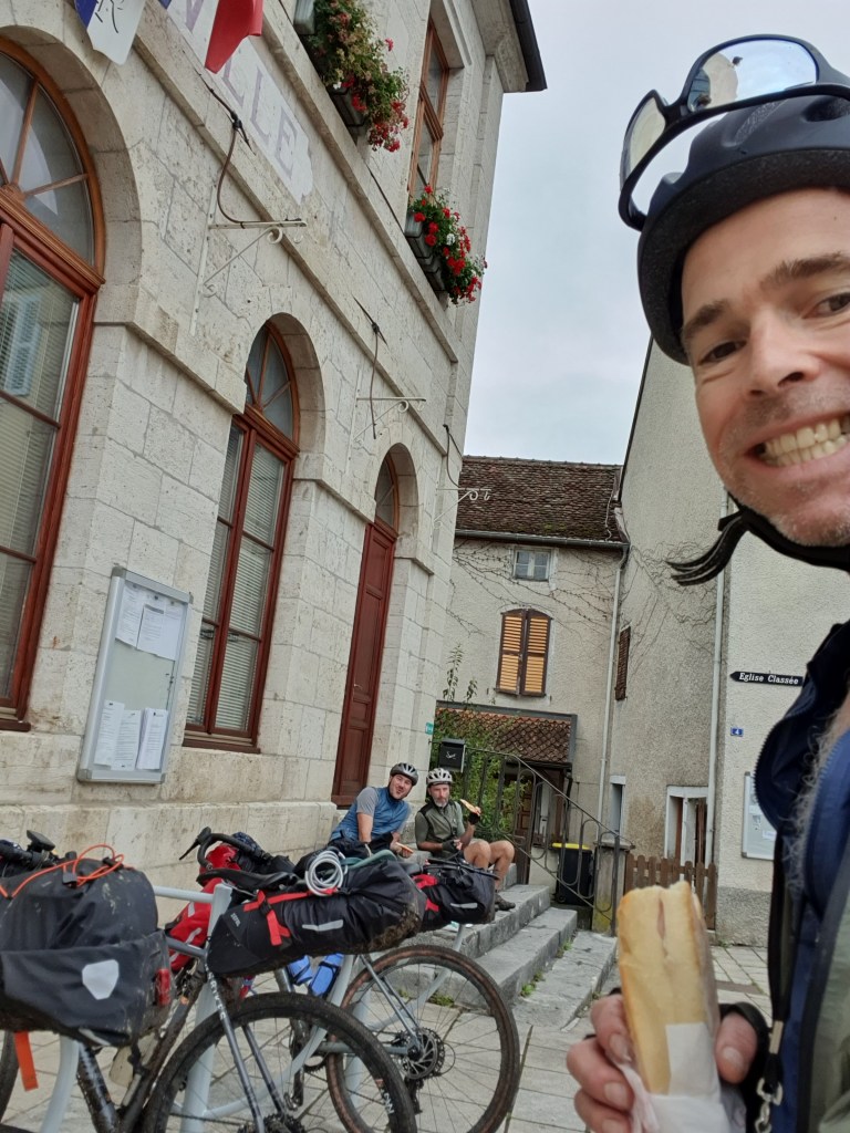Juju est en forme, il montre les muscles dans les 1ères côtes tel un mâle dominant 💪, Greg le suit et moi je sens que je peine un peu à maintenir l’allure, le 2ième col se prénomme « le passage de la douleur », ça me parle bien 😰. Au contraire du Morvan, nous traversons pas mal de petits villages, ce qui nous permet de se recharger en eau régulièrement dans les cimetières, c’est plutôt agréable, pas les cimetières mais les villages😉. Par contre on ne s’arrête pas si souvent car mine de rien il faut les enquiller les 112bornes et 2700mD+ !! Nous décidons tout de même de faire une pause casse-croute à Saint Hippolite au 35ième km avant d’attaquer la plus longue montée du jour (environ 20km). A noter que toutes les boulangeries situées sur notre parcours sont vraiment de qualité, mention spéciale pour celle de Pontarliers 😄 (2ième jour).