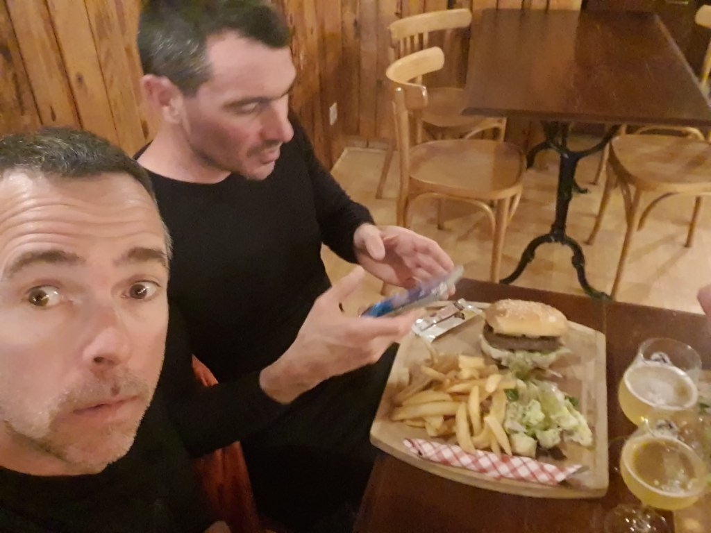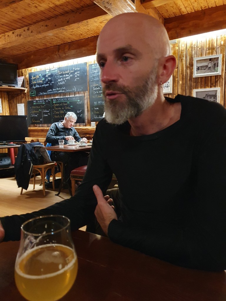 On s’arrête à 40km de l’arrivée dans une station de ski où on a la chance de pouvoir prendre un café ☕mais hors de question de rester à l’intérieur au chaud tellement on est frigorifié cela serait trop difficile de repartir, donc on le prend dehors. Je lutte de plus en plus, je dois faire une hypoglycémie en plus d’une hypothermie bref je suis hypopasbien 😅. Une dernière montée avant Morteau où je suis très mal, on arrive en haut, le calvaire va bientôt se terminer. Dans la descente vers Morteau Juju choisit ce moment là pour crever à 4km de l’arrivée, dans des conditions normales no problemo, mais le fait de nous arrêter, de réparer pendant 15min, je suis en train de crever sur le côté, mes fesses bougent toutes seules, je ne contrôle plus mon corps et ça fait marrer mes 2 ânes de copains 🥶. Juju lui n’a pas froid je le nomme « l’homme des bois » depuis ce moment et Greg commence à virer comme moi… Nous repartons tant bien que mal et arrivons à l’hôtel des Montagnards que nous avions réservé vu la météo, bien m’en a pris !! Quand le patron voit mon état il me donne les clefs de la chambre direction la douche chaude et s’occupe de mon vélo avec les copains, accueille trop top, la douche va me ramener à la vie, un vrai bonheur que l’on ne peut apprécier qu’après une journée si dure. Le soir nous nous régalons d’un burger et de quelques cervoises tant méritées🍻🍔, le bonheur.