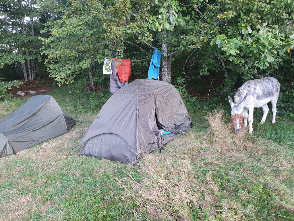 Nous retrouvons tant bien que mal notre trace et enfin arrivons au Refuge situé à 1200m d’altitude. Notre 4ième comparse Ben arrive en même temps que nous pour continuer l’aventure, c’est génial de se retrouver au fin fond du Jura. Au Refuge « La loge à Ponard » c’est la soirée de fin de saison, donc nous plantons les tentes au milieu des ânes 🐴, prenons une bière avec une assiette de charcuterie 🍻🥓 et profitons d’un concert complétement psychédélique, avec musiciens déguisés en costumes d’animaux, instruments fabriqués mains, bref une soirée hors du temps.
