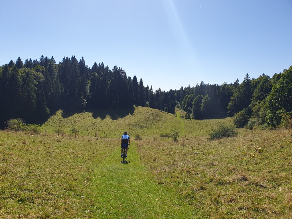 C’est parti pour descendre vers le sud avec les lacs de Neuchatel et Léman sur notre gauche. Cela monte pas mal au début mais moins dur que la veille et la météo change vraiment la donne. Les vaches sont au rdv et elles nous obligent involontairement à passer un nombre élevé de passage sur-elevé. Attention à ne pas se blesser sur ces passages, j’y laisserais un bout de cuissard dans un barbelé. Nous décidons de faire un détour par Pontarliers vers le 30ième km pour bien se ravitailler, un petit café dans le centre bourg en terrasse puis c’est reparti pour une grosse côte en sortie de la ville.