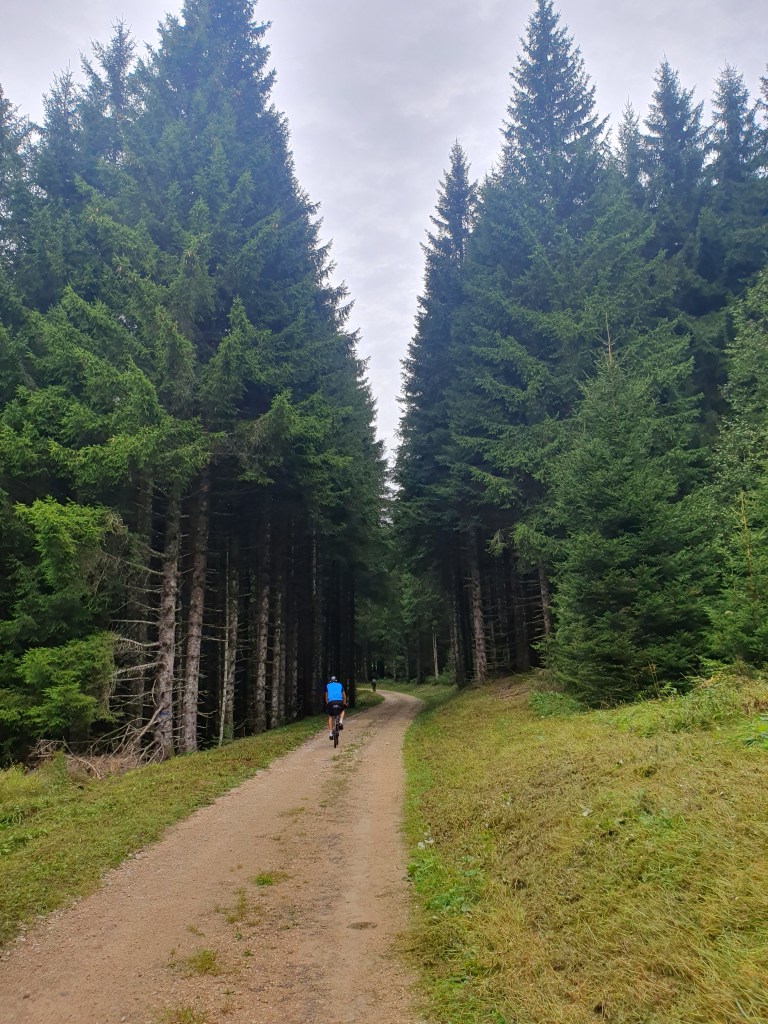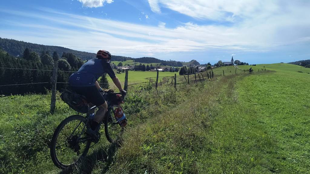 La météo est encore au beau fixe, la trace est très roulante sur la 1ère moitié, ça fait du bien de rouler « facile ». Un café à Lamoura où nous croisons Greg au bord d’un étang puis direction Les Moussières. Petit focus sur la trace que nous empruntons pour cette GTJ, en fait c’est une trace complétement Gravel avec son balisage propre (attention balisage perfectible, il faut absolument la trace GPX en doublon, disponible sur le site de la GTJ), et donc elle emprunte environ 80% de la trace VTT et 20% de chemins plus roulant. La descente vers Saint Germain de Joux est vraiment sympa, on fait également une longue descente pleine balle sur une route sinueuse, moment très grisant quoique légèrement dangereux après réflexion.