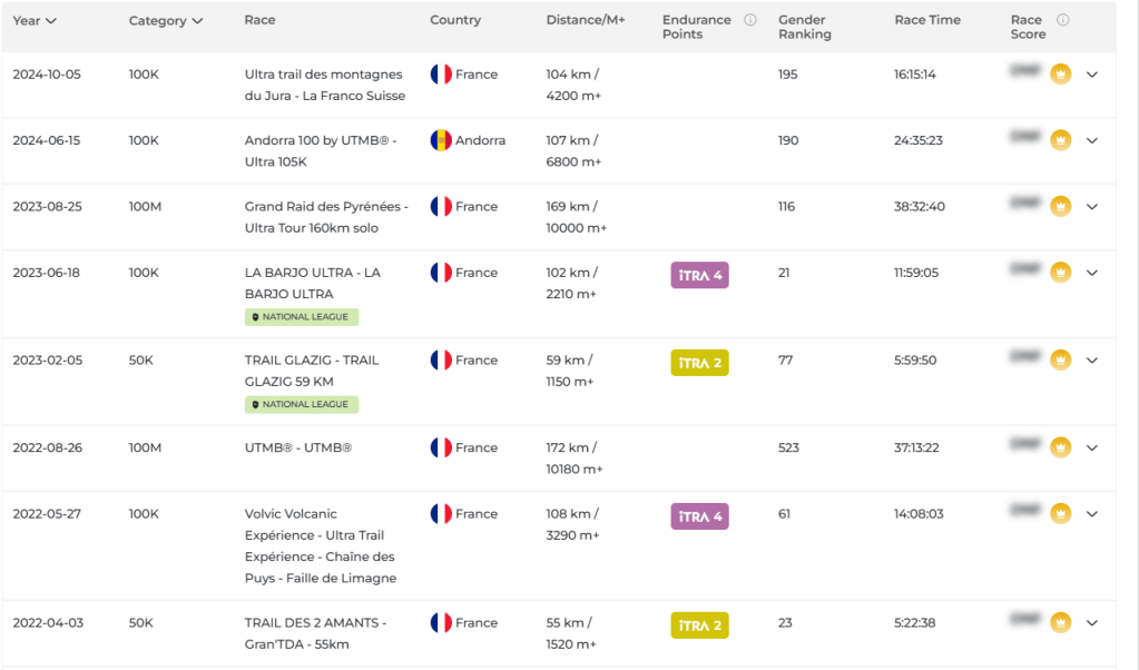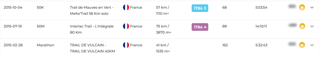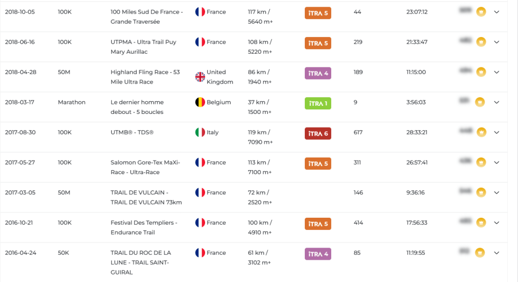 Pas facile de faire un planning en Ultra, mais il y a forcément des courses qui font rêver quand on aime ce sport. En bas de cette page vous trouverez une vue de ma fiche ITRA (chaque traileur en possède une dès lors qu’il participe à des courses référencées ITRA). Cela résume les courses que j’ai courues et dont vous retrouverez un récit sur le blog .